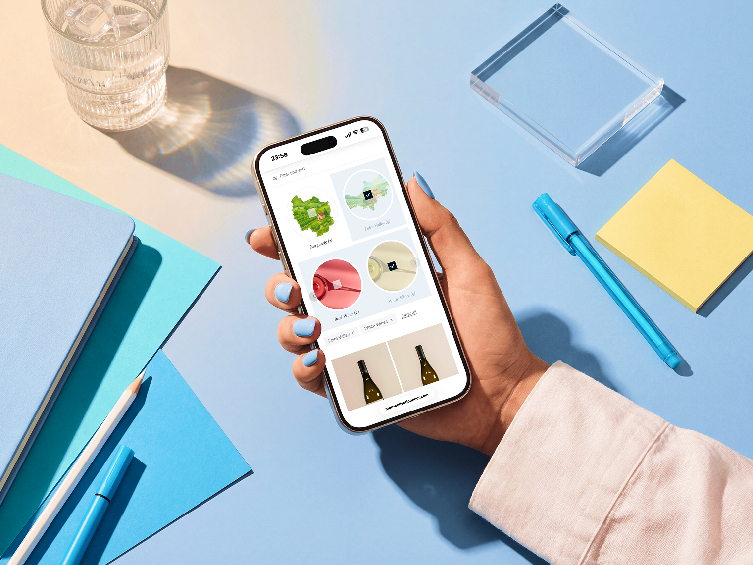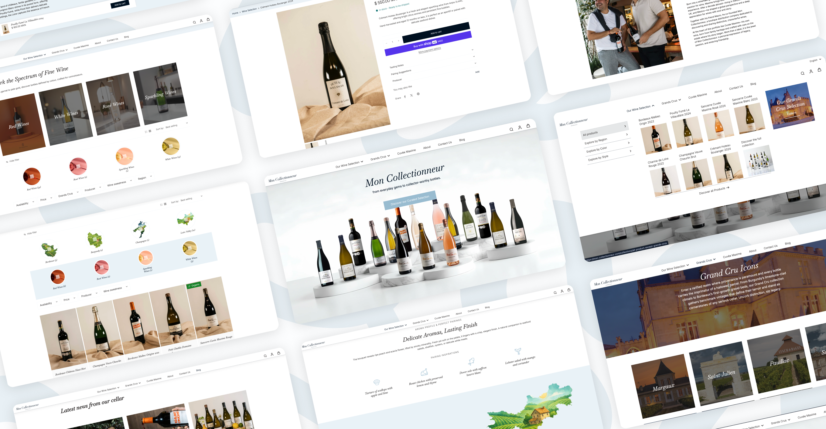 L’un des enjeux majeurs du site était la structuration du catalogue. Nous avons conçu une architecture claire et intuitive en exploitant pleinement les collections Shopify afin de faciliter la recherche et l’exploration. Les vins sont organisés par type, par usage et par catégories spécifiques, avec une séparation claire des grands crus, pour permettre à chaque client de trouver rapidement ce qu’il recherche, quel que soit son niveau de connaissance.